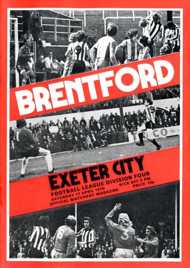 Why Brentford? That’s probably a less-often asked question now that the team has consolidated itself in the Premier League, but in the Fourth Division days of the 1970s it was often asked, often with a knowing smirk. My family home was in the west London suburb of Chiswick, roughly equidistant between Brentford and Queens Park Rangers (QPR), and not much further from Fulham and Chelsea. I had been interested in football from a very young age – my first sporting memory is of the England v West Germany World Cup quarter final in Mexico in 1970, which watched on TV with my two older brothers, Richard and David. But I hadn’t felt a strong sense of support for any team, bar a brief flirtation with Tottenham in line with some other kids at school. My parents were not football supporters, and my grandfathers had both come from east London and supported West Ham and Millwall respectively, and that all seemed a bit far away. Richard supported Chelsea, and started going to matches as soon as he could, while David balanced enthusiasm for Everton, QPR, and Brentford – as these clubs were never in the same division back then, I guess it worked. Our uncle took us all to some QPR games: the first professional game I saw was a QPR win over Portsmouth at Loftus Road. I certainly enjoyed them in that era of Stan Bowles, Gerry Francis and the rest, but I never developed a sense of support or belonging. That didn’t come until that day in April 1976 when I watched, as one of a crowd of 4,175, Brentford put five past Exeter, the scorers Paul Bence, Andy McCulloch, Roger Cross, and Mickey French with a brace.